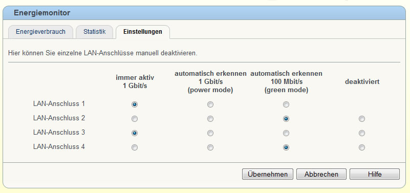 In meinem Heimnetzwerk finden sich wenig GBit-fähige Geräte: gerade einmal ein stationärer Computer ist mit einer GBit Netzwerkkarte bestückt, die älteren Modelle haben noch eine 100 MBit Karte intus und die restlichen Geräte sind allesamt per WLAN angebunden. Dieser eine Computer, der logischerweise auch das meistgenutzte stationäre System darstellt, ist an Port 1 der Fritz!Box angeschlossen und war bis dato folgerichtig auch per GBit LAN verbunden. Das spielte bislang im Grunde keine große Rolle, der limitierende Faktor waren die übrigen Systeme – mehr als 100 MBit ging einfach nicht durch das Netzwerk. Das ändert sich nun aber mit dem NAS System, denn dieses hält einen GBit Port vor. Nach der heutigen Einrichtung war dann aber etwas faul: in der Fritz!Box wurde das NAS Gerät nur mit einer 100 MBit Verbindung angezeigt. Schnell stellte sich die Frage, ob entweder eine NAS-seitige Einstellung die Geschwindigkeit auf 100 MBit limitierte oder ob die Fritz!Box dies tat. Schnell war klar, dass letzteres der Fall war und das sogar sinnvollerweise. Die Fritz!Box Energiespareinstellungen scheinen nämlich Port 2 bis 4 standardmäßig im 100 MBit green mode zu belassen, d.h. auch bei einem GBit-fähigen Gerät wird nicht hochgeschaltet. Nur Port 1 scheint davon unbetroffen zu sein, aber hier dürfte auch meistens der einzige Computer im Haushalt vorzufinden sein, diese Default-Einstellung macht also Sinn. Letztendlich reichte es also aus, Port 3 (an dem das NAS nun hängt) auf immer aktiv 1 Gbit/s zu setzen, um den Datenverkehr zwischen dem GBit-fähigen System und dem NAS zu beschleunigen.