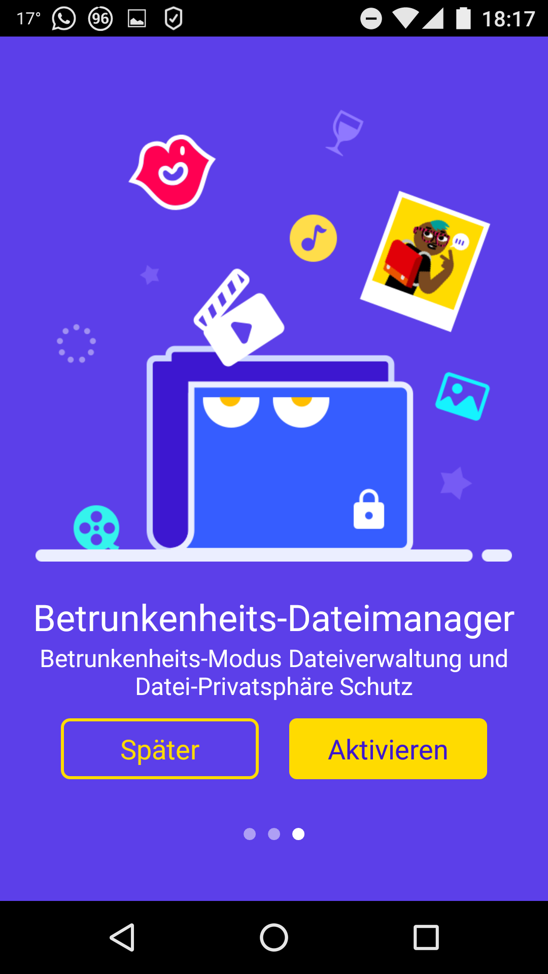 Auch wenn die ersten beiden Funktionen, „Betrunkenheits Wählscheibe“ und „Wo war ich?“, in manch intensivem Zustand durchaus ihre Berechtigung haben dürften: spätestens der Betrunkenheits-Dateimanager wirkt dann doch etwas too much (zum Glück habe ich in solchen Situationen noch nie wichtige Dateien gelöscht, Glück gehabt!) 😀