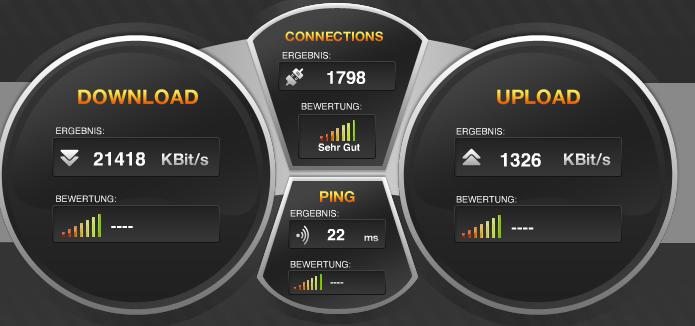 In der Schweiz angekommen fiel einer der ersten Blicke natürlich auf die neue VDSL getriebene Leitung, die nun mit 20 MBit/s im Down- sowie 1 MBit/s im Upstream recht üppig ausfällt. Ob sich diese Bandbreite auch erreichen lässt, habe ich anhand eines SpeedTests kurz angetestet. Das Ergebnis lautet eindeutig ja, die Bandbreite kann voll ausgereizt werden, der Router scheint sich also auch auf die volle Bandbreite synchronisiert zu haben. Die Schwankung nach oben ist eher dem Speedtest geschuldet, hier spielen viele Einflüsse einer genauen Messung entgegen. Das nächste Thema wäre IPTV, aber eins nach dem anderen.. 😀
