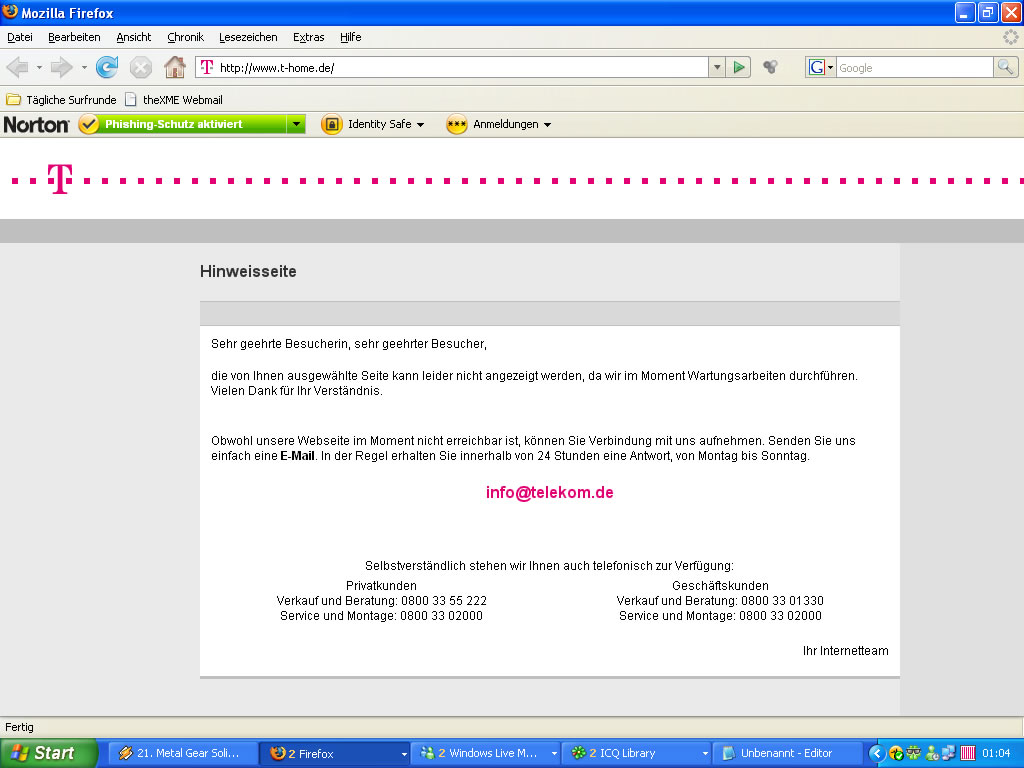 Screenshot: T-Online Wartungsarbeiten