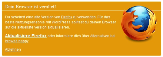 Eine amüsante Sache am Rande: da ich meinen heimischen Computer in letzter Zeit dank Notebook und Tablet weniger genutzt habe, ist leider die Firefox Version lokal noch nicht bei Version 9 angekommen. Hätte ich gar nicht bemerkt, wenn WordPress 3.3 mich nicht im Adminbereich wie folgt erinnern würde 😀