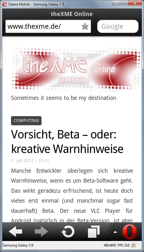Vor einigen Wochen habe ich heimlich im Hintergrund das WordPress Plugin WordPress Mobile Pack aktiviert, um mobilen Nutzern eine etwas angenehmere Ansicht des Blogs zu ermöglichen. Das war gewiss nicht ganz uneigennützig, ich selbst greife auch sehr oft zum Smartphone. Das eben vorgestellte Plugin bringt neben der Erkennung mobiler Endgeräte auch gleich einige mobile Themes mit, die sich allerdings relativ spartanisch halten. Nachdem ich gestern das Design des Blogs aufgefrischt habe, war heute aus diesem Grund eine kurze Surfrecherche nach mobilen Themes an der Reihe. Auf Anhieb gefiel mir das Theme Codium Extend, sodass dieses nun mobilen Nutzern standardmäßig angezeigt wird. Ein Wechsel zur Desktop-Ansicht ist natürlich weiterhin möglich (über den Link „Zur Desktop-Ansicht wechseln“ relativ weit unten“). Beim Testen des Themes hat mir im übrigen der Opera Mobile Emulator sehr geholfen, so erspart man sich den ständigen Griff zum Smartphone.
